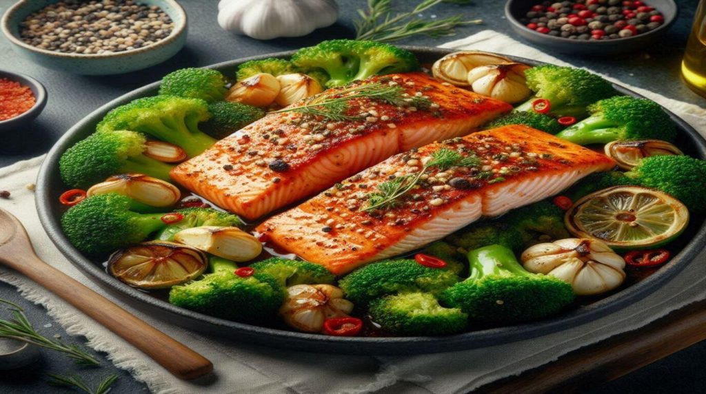 A metabolism-boosting dinner recipe featuring omega-3-rich salmon seasoned with spicy herbs, paired with garlic-roasted broccoli. Quick to prepare, low in calories, and full of nutrients essential for effective weight loss.
